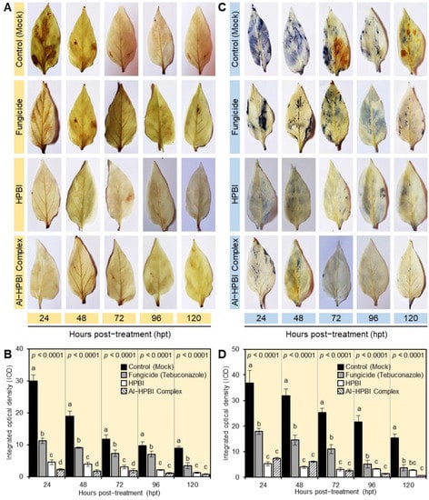 Pepper leaves were collected at 24-, 48-, 72-, 96-, and 120-hours post-treatment (hpt) with tested compounds, as well as both controls (Mock and fungicide), to assess hydrogen peroxide (H2O2) and superoxide anion (O2•−). H2O2 was histochemically localized, as described by Romero-Puertas et al. and Shi et al. [30,31], using 3,3-diaminobenzidine (DAB; Sigma-Aldrich, Darmstadt, Germany), with slight modifications, as published previously [32,33], until the development of a brown color. Likewise, in situ histochemical localization of O2•− was assessed using nitro blue tetrazolium (NBT; Sigma-Aldrich, Darmstadt, Germany) until the development of a purple color. The intensity of the brown (as an indicator of H2O2) or purple (as an indicator of O2•−) colors was determined using the Image J image processing tool, Fiji version (http://fiji.sc; access date 20 June 2022), after bleaching the leaves with 0.15% (w/v) trichloro acetic acid (TCA) in ethanol:chloroform 4:1 (v/v) [34].