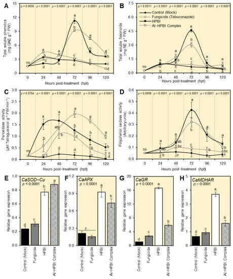 In the enzymatic antioxidant defense machinery, superoxide dismutase (SOD) catalyzes the conversion of superoxide ion (O2−•) to hydrogen peroxide (H2O2) [76], then ascorbate peroxidase (APX) catalyzes the transformation of H2O2 into H2O. Moreover, peroxidase (POX) controls the level of H2O2 in plant tissues [72] and directly scavenges H2O2 and O2−• to reduce their reactivity [73]. Our findings showed that the root application of HPBI or its aluminum complex significantly enhanced the enzymatic activities of POX and PPO and upregulated four antioxidant-related genes including CaSOD-Cu, CaAPX, CaGR, and CaMDHAR at 72 hpt. Collectively, these findings support our suggestion that treatment with HPBI or its aluminum complex induces the activation of enzymatic antioxidant defense machinery within infected pepper plants.