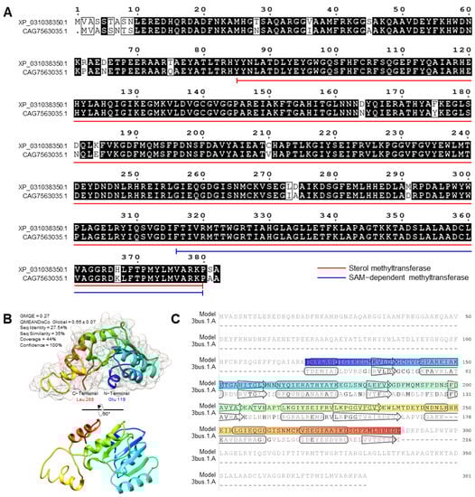 In silico analysis of Sterol 24-C-methyltransferase (EGR6) of Fusarium equiseti. (A) Multiple sequence alignments of EGR6 from F. oxysporum (FoEGR6; XP_031038350.1) and F. equiseti (FeEGR6; CAG7563035.1). Black shading denotes conserved amino acids, while white background denotes a low similarity score. Red and blue lines below the sequences indicate the conserved domains of Sterol methyltransferase and SAM−dependent methyltransferase, respectively. Whiskers suggest the beginning and the ending of each domain. (B) The predicted crystallographic three-dimensional (3D) modeling of 24-C-methyltransferase from F. equiseti (FeEGR6; CAG7563035.1). (C) Model–template alignment of FeEGR6 from F. equiseti. GMQE: Global model quality.