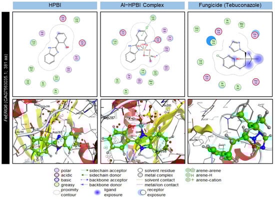 Two-dimensional (2D) and three-dimensional (3D) docking interaction of HPBI, Al−HPBI complex, and Fungicide (Tebuconazole) with 24-C-methyltransferase (ERG6) from F. equiseti (FeEGR6; CAG7563035.1).