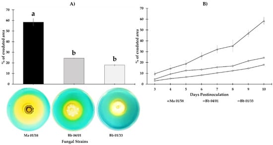 There were significant differences amongst isolates in siderophore production 10 dpi (F2,21 = 117.73, p = 0.000); M. brunneum isolate EAMa 01/58-Su was the most capable of changing the largest area of CAS agar from blue to orange (58.4%), while B. bassiana isolates EABb 04/01-Tip and EABb changed the color of only 24.35% and 17.88%, respectively (Figure 1). The timeline for Fe siderophores exudation shown in Figure 3 reveals the difference between the M. brunneum isolate and the others from 3 dpi onwards.