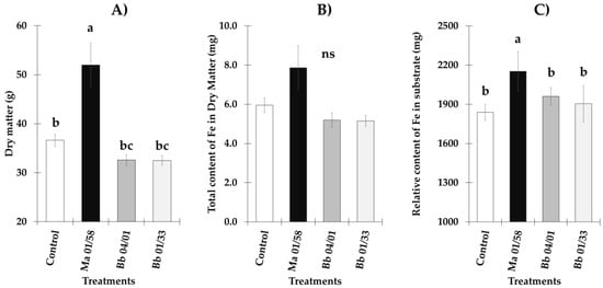 Iron siderophore production data, total and relative content of Fe in dry matter and substrate and data of FRA were analyzed using analysis of variance (ANOVA) followed by a Tukey multiple range test, different letters over the bars indicate significant differences (p < 0.05) among treatments (Statistix 9.0®, Analytical Software, Tallahassee, FL, USA).