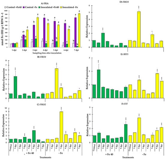 Evolution of FRA along seven days of observation and relative expression of FRO1, FRO2, FRO3, IRT1 and FIT, in C. melo roots. Four treatments were used, namely, (i) Control + Fe40µM (un-inoculated), (ii) Inoculated + Fe40µM, (iii) Control - Fe (un-inoculated) and (iv) Inoculated - Fe. The expression of control treatment for each nutritional condition is presented once, at the beginning of the graph, with the relative expression comparison method used, the control is always equal to 1. Data of gene expression represent the mean of three independent technical replicates, according to the Dunnett’s test, * (p < 0.05), ** (p < 0.01) or *** (p < 0.001) over the bars indicate significant differences in relation to the control treatment. In the case of FRA, letter over the bars denote significant difference between plants inoculated and control plants analyzed by completely randomized ANOVA followed by a Tukey test (p < 0.05).