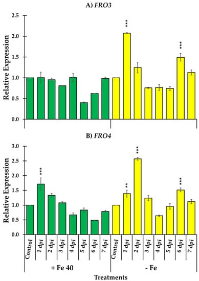 Relative expression of FRO3 (A) and FRO4 (B) on shoots of C. melo. Four treatments were used, namely, (i) Control + Fe40µM (un-inoculated), (ii) Inoculated + Fe40µM, (iii) Control - Fe (un-inoculated) and (iv) Inoculated - Fe. The expression of control treatment for each nutritional condition is presented once, at the beginning of the graph, with the relative expression comparison method used, the control is always equal to 1. Data of gene expression represent the mean of three independent technical replicates, according to the Dunnett’s test, * (p < 0.05), ** (p < 0.01) or *** (p < 0.001) over the bars indicate significant differences in relation to the control treatment.