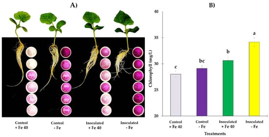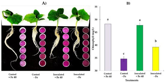 (A) General panorama of FRA on roots of C. sativus. On the right side of the roots, the indicator solution containers can be seen at 5 dpi, the FRA is generally highly induced, however, as can be seen in the intense purple color, inoculated plants exceed their respective control; shoots of inoculated plants did not show sever symptoms of chlorosis like occurred in plants without inoculation. (B) Mean of SPAD values from at 7 dpi showed significant difference between control and inoculated plants grown in Fe deficient conditions, exceeding inoculated plants their respective control. Letter over the bars denote significant difference between plants inoculated and control plants analyzed by completely randomized ANOVA followed by a Tukey test (p < 0.05).