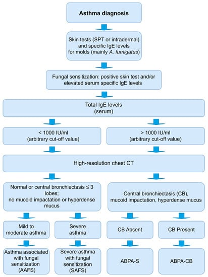 Severe asthma with fungal sensitization (SAFS) can be addressed as an intermediate disease between allergic asthma and allergic bronchopulmonary aspergillosis [47]. Fungal spore exposure and IgE sensitization have been associated with worsening asthma symptoms, reduced lung function, increased hospital admissions, and asthma-related mortality in children and adults [47]. Nearly 20% of patients with severe asthma have positive SPT or in vitro tests for fungus-specific IgE, and fungal sensitization is associated with increased asthma severity [45]. In some SAFS patients, several radiological abnormalities observed on high-resolution chest computed tomography (CT) (i.e., minor degrees of bronchiectasis, upper lobe fibrosis, tree in bud, and consolidation) have been reported [48]. The criteria proposed for SAFS diagnosis include the occurrence of severe asthma (which is symptomatic and uncontrolled asthma despite the treatment with high doses of inhaled corticosteroids plus a second controller and/or systemic corticosteroids) [49], evidence of IgE sensitization to molds (SPT or fungal-specific IgE), mainly to thermotolerant filamentous fungi (Aspergillus spp. or Penicillium spp.), and exclusion of ABPA (Figure 1) [16,47].