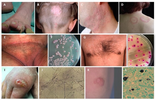 From a clinical point of view, dermatophytosis or tinea is named according to the infection site. If the infection involves the foot, it is called tinea pedis or “athlete’s foot” (Figure 2A). in the scalp, is tinea capitis (Figure 2B); a rare variant is tinea capitis favosa, caused by Trichophyton schoenleinii, which occurs in children and adolescents; on the beard and moustache areas of men is tinea barbae (Figure 2C); in the hand region is tinea manuum; in the face is tinea faciei; on the nails and surrounding tissue is tinea unguium; in the upper body (trunk, shoulder, armpit, chest, and back) is tinea corporis (Figure 2D). Independently of the body location or etiological agent, when the infection is misdiagnosed and masked by topical corticosteroids, it is designated tinea incognito [151,157].