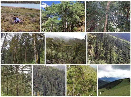 Vegetation types in the Shaluli Mountains. (A) SS; (B) Pin; (C) Pop; (D) PQ; (E) Que; (F) Abi; (G) PA; (H) Pic; (I) Jun; (J) AM.