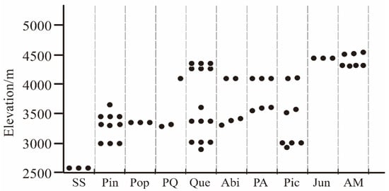 Sample plots distribution and elevation. The horizontal axis is the vegetation type, arranged from left to right according to the average elevation from low to high.