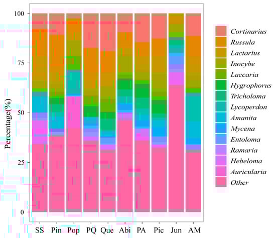 To assess the effect of different vegetation on macrofungal community composition, we compared β-diversity and macrofungal community composition between vegetation types using Bray–Curtis distances and constrained principal coordinate analysis (CPCoA) (Figure 8). The results showed some similarity in the macrofungal community composition of Jun and AM, as well as Pin, Abi, PA, and Pic, indicating similar macrofungal community composition of vegetation corresponded with similar elevation distribution. The macrofungal community composition of the four groups of vegetation types: SS; Pin, Abi, PA, and Pic; Que; Jun and AM were significantly different, indicating that the macrofungal community composition of vegetation with large elevation variation was significantly different.