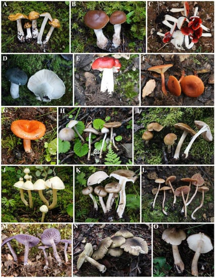 Photos of dominant genera. (A) Cortinarius aurantionapus; (B) C. illuminus; (C) Russula cf. emetica; (D) R. cf. faustiana; (E) R. cf. emetica; (F) Lactarius alpinihirtipes; (G) L. aurantiosordidus; (H) Inocybe geophylla; (I) I. cf. ceskae; (J) Hygrophorus cf. chrysodon; (K) Hygrophorus cf. agathosmus; (L) Laccaria bicolor; (M) L. moshuijun; (N) Tricholoma atrosquamosum; (O) T. saponaceum.