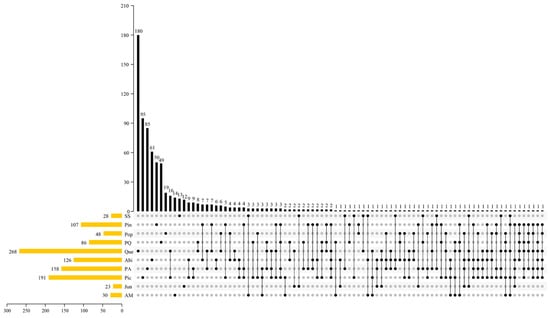 UpSet plots were used to display the overlap between ten vegetation types of macrofungal species. The horizontal bars indicate the number of macrofungal species in each vegetation type, with 28, 107, 48, 86, 268, 126, 158, 191, 23, and 30 species identified in SS, Pin, Pop, PQ, Que, Abi, PA, Pic, Jun, and AM, respectively. The vertical bars display the number of unique and shared species. Specifically, 13, 50, 19, 49, 180, 61, 85, 95, 12, and 14 species were identified as endemic to each vegetation type and found only in that type.