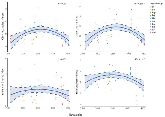 The alpha diversity of macrofungi was corrected by repeated sampling of plots, and the results showed significant differences in macrofungal species richness and diversity between vegetation types (Figure 6E–H). The ten vegetation types included in this study, SS, Pin, Pop, PQ, Que, Abi, PA, Pic, Jun, and AM, were located at gradually increasing elevations (Figure 2), where their macrofungal alpha diversity tended to increase and then decrease with increasing elevation (Figure 7). It was also found that the alpha diversity of macrofungi was higher in vegetation types containing Picea, Abies, and Quercus genera than in other vegetation types. In contrast, the macrofungal diversity of four vegetation types, SS, Pin, Jun, and AM, was relatively low.