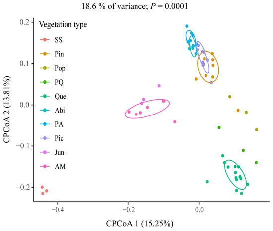 Constrained PCoA plot of Bray–Curtis distances constrained by vegetation type (18.6% of variance explained, p = 0.001; n = 62). Each point corresponds to a different sample with colors indicating vegetation type. The percentage of variation indicated on each axis corresponds to the proportion of the total variance explained by the projection.
