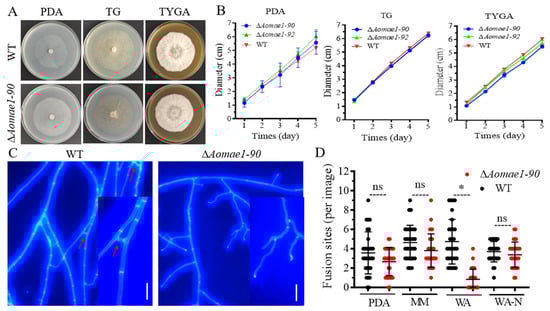 Two positive transformants were acquired and confirmed using PCR and RT-qPCR methods (Figure S1B,C). By comparing the colony diameter, the mycelial growth rate of the ΔAomae1 mutants was faster than that of the WT strain on the PDA medium, but there was no statistically significant difference between them, and the ΔAomae1 mutants showed a WT-like phenotype for mycelial growth on the TG medium, whereas the WT strain was slightly faster than the mutants on the TYGA medium (Figure 1A,B). In addition, CFW staining results showed that the deletion of Aomae1 resulted in blocked mycelial fusion, which was related to nutrient availability. There was no difference in hyphal fusion between the WT and ΔAomae1 mutant strains on the three media of PDA, MM, and WA-N, whereas it was significantly different on the WA plate (Figure 1C,D).