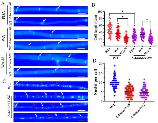 Comparison of the cell length and nuclei between WT and mutant strains. (A) Observation of hyphal septa of the WT strain and ∆Aomae1 mutant cultured on PDA, WA, and WA (after nematode induction). White arrows indicate hyphal septa; scale bar = 5 μm. The mutant isolate ∆Aomae1-90 was used as a representative strain. (B) Comparison of cell length of WT and ∆Aomae1 mutant strains. The WT and mutant strains were incubated on PDA, WA, and WA-N media for five days, and 50 random photographs were used to determine the hyphal cell length. (C) Observation of cell nuclei of WT and ∆Aomae1 mutant, scale bar = 5 μm. White arrows indicate hyphal septa and red arrows indicate nuclei. (D) Comparison of the number of nuclei. The WT and mutant strains were incubated on a PDA medium for five days, and 50 random photographs were used to determine the number of nuclei. An asterisk (B,D) indicates a significant difference between the ∆Aomae1 mutant and the WT strain (Tukey’s HSD, * p < 0.05).