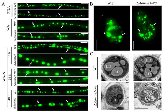 Observation of LD accumulation in the mycelia and conidia of the WT and ∆Aomae1 mutant strains. The mutant isolate ∆Aomae1-90 was used as a representative strain. (A) BODIPY staining under different culture conditions, scale bar = 5 μm. The WT and mutant strains were stained with BODIPY for observation of the LD morphology after five days of incubation in PDA, WA, and WA-N media. (B) LD staining for conidia, scale bar = 5 μm. The arrows in (A,B) indicate the LDs. (C) Observation of LDs via TEM; the WT and mutant strains were incubated on a PDA medium. LD, lipid droplet; V, vacuole.