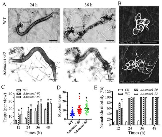 Comparison of trap formation and pathogenicity. (A) Representative images of trap formation and nematode predation at 24 and 36 h, scale bar = 100 μm. (B) Comparison of the trap morphology of each strain at 48 h, scale bar = 20 μm. (C) Comparison of the number of traps. (D) Comparison of mycelial loops. A total of 30 random traps were used to determine the mycelial loops. (E) Comparison of nematode mortality. An asterisk (C–E) indicates a significant difference between the ∆Aomae1 mutant and the WT strain (Tukey’s HSD, * p < 0.05). CK indicates the natural death rate of nematodes incubated on the WA medium.