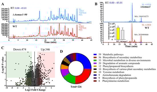 The extracts of the WT and ∆Aomae1 mutant strains were analyzed using LC-MS. After a comparison of the chromatograms, we found that the ∆Aomae1 mutant showed a different characteristic peak at 36 min compared to the WT strain (Figure 6A). In addition, arthrobotrisins, specific metabolites produced by A. oligospora and other NT fungi, were analyzed and the peak area of the arthrobotrisins decreased by 19.8% in the ∆Aomae1 mutant compared with the WT strain (Figure 6B). Metabolic data analysis revealed that 474 compounds were downregulated, and 346 compounds were upregulated in the ∆Aomae1 mutant versus the WT strain (Figure 6C). KEGG enrichment analysis revealed that 226 differential compounds were highly enriched in the metabolic pathways, including the biosynthesis of secondary metabolites, microbial metabolism in diverse environments, degradation of aromatic compounds, phenylpropanoid biosynthesis, tyrosine metabolism, and biosynthesis of various plant secondary metabolites (Figure 6D).