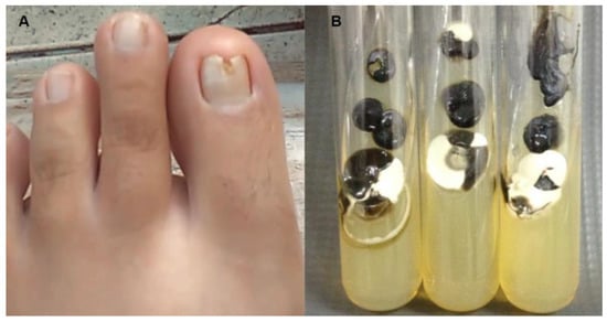 Onychomycosis is a chronic infection caused by nail fungi, primarily caused by dermatophytes, followed by yeasts and non-dermatophyte filamentous fungi []. Yeasts of the genus Candida are widely reported to cause various pathologies [] and commonly cause onychomycosis, with species of the C. parapsilosis complex being the main ones involved in nail mycoses [,]. The black yeast, Exophiala dermatitidis, is characterized as a pathogen that acts opportunistically [], often present in the respiratory tract of patients with cystic fibrosis and/or causing other types of superficial and skin infections, which are underdiagnosed worldwide [].