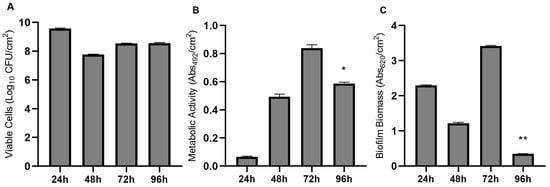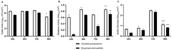 When performing the mixed biofilm formation of the two yeasts, it was possible to observe that together they were also able to form biofilm over time (Figure 3). The number of viable cells (Figure 3A) was highest at 24 h (9.57 Log10 UFC/cm2) (Table S2), where both showed similar growth (5.23 Log10 UFC/cm2 Candida parapsilosis and 4.36 Log10 UFC/cm2 Exophiala dermatitidis). However, over time the number of viable cells of C. parapsilosis (48 h with 4.44 Log10 UFC/cm2; 72 h with 4.75 Log10 UFC/cm2; 96 h with 4.51 Log10 UFC/cm2) was higher than E. dermatitidis (48 h with 3.30 Log10 UFC/cm2; 72 with 3.77 Log10 UFC/cm2; 96 h with 4.00 Log10 UFC/cm2). The highest mitochondrial activity (Figure 3B) was at 72 h (0.84 Abs492/cm2), decreasing significantly (p < 0.05) at 96 h (0.58 Abs492/cm2). The total biomass of the mixed biofilm (Figure 3C) was significantly higher (p < 0.05) at 72 h (3.41 Abs620/cm2), with a significant decrease (p < 0.05) at 96 h (0.35 Abs620/cm2).