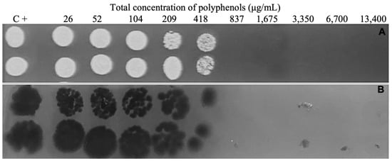 In vitro antifungal susceptibility for planktonic cells was performed according to Corrêa et al. []. The serial dilution was performed at a ratio of 1:2, and PE concentrations ranged from 13,400 to 26 μg/mL of total phenol content (TPC). Moreover, a test using only ethanol (70%, w/w) was also accomplished, aiming to serve as a control to detect possible interference of this solvent. After incubation at 35 °C for 48 h, the minimum inhibitory concentration (MIC) was determined by direct observation. The minimum fungicidal concentration (MFC) was determined by seeding the suspensions exposed to different PE concentrations on SDA plates. Plates were incubated at 35 °C for 24 h, and the MFC was defined as the lowest concentration of the test compound in which no recovery of microorganisms was observed. The obtained MIC and MFC results were corresponding.