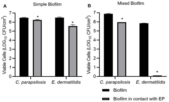 Regarding the effect of PE on the simple biofilm of C. parapsilosis and E. dermatitidis, for both yeasts, the reduction of biofilm was significant (p < 0.05) when PE was added. For E. dermatitidis, the reduction was 1 Log, corroborating the literature in which PE is able to reduce single fungal biofilm, the concentration varying according to the species and type of propolis [,,].