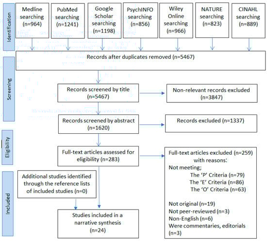 S databases used for the literature search produced 6937 articles. After 1470 duplicates were eliminated, 3847 unique articles were disqualified from the screening on the basis of the title. After screening the remaining 1620 articles in the abstract, 1337 were eliminated, leaving 283 articles. Two hundred fifty-nine articles were found to be ineligible after reviewing the entire contents, with not meeting the participant criteria being the most frequent cause. More information on the exclusion criteria is provided in the PRISMA flowchart [] (Figure 1). In the end, 24 articles met the criteria for this systematic review.