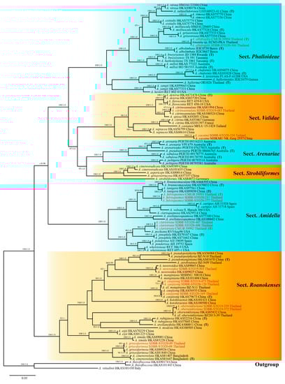Notes: According to previous studies, Amanita sect. Phalloideae phylogenetically comprises three subclades that are well supported in phylogenetic analyses and by morphological evidence. Our multi-locus phylogenetic analysis also presented the same result. These three subclades may be treated as subsections or new sections [2,4,26,54] in the future.