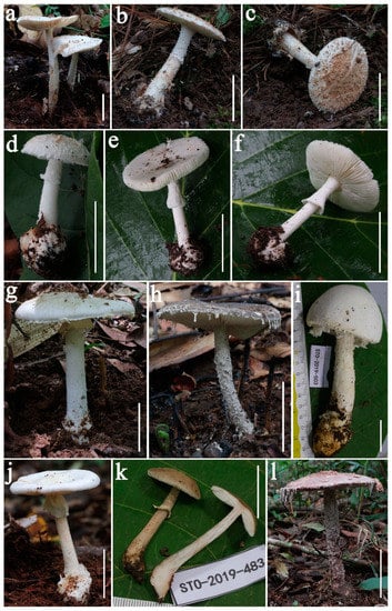 Fresh basidiomata of studied Amanita species. (a) A. claristriata (CMUB39992, holotype). (b–d) A. fulvisquamea [(b,c) CMUB39993, holotype; (d) SDBR-STO20-211)]. (e,f) A. albifragilis (CMUB39994, holotype). (g) A. caojizong (SDBR-STO20-120). (h) A. griseofarinosa (SDBR-STO20-08). (i) A. neoovoidea (SDBR-STO19-503). (j) A. oberwinkleriana (SDBR-STO19-359). (k) A. citrinoannulata (SDBR-STO19-483). (l) A. cacaina (SDBR-STO20-324). Scale bars: (a–k) = 3 cm, (l) = 9 cm.