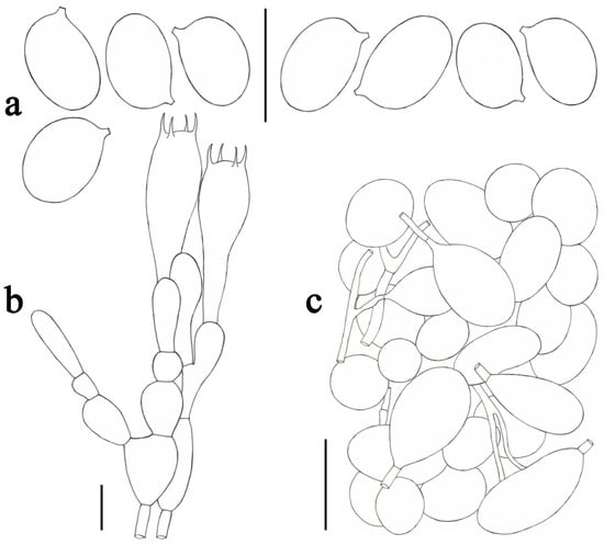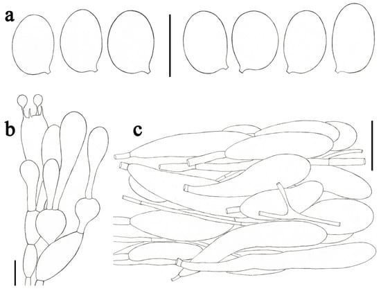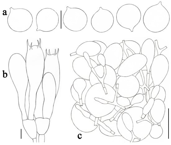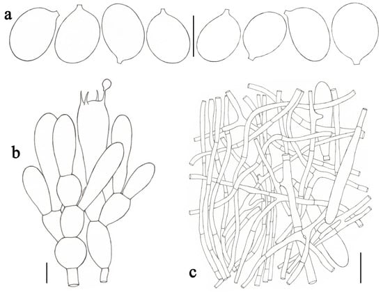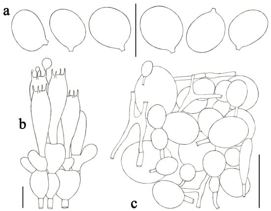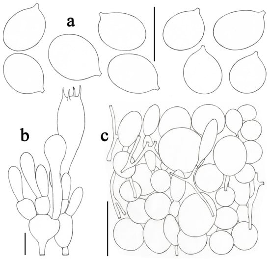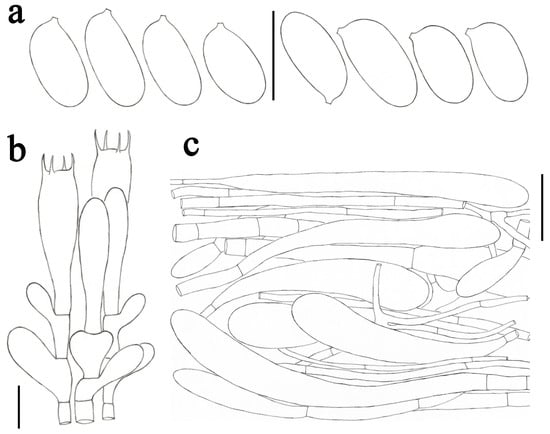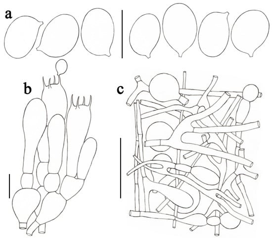 Amanita griseofarinosa (SDBR-STO20-09). (a) Basidiospores. (b) Hymenium and subhymenium. (c) Longitudinal section of volval remnants on pileus. Scale bars: (a,b) = 10 μm, (c) = 50 μm.