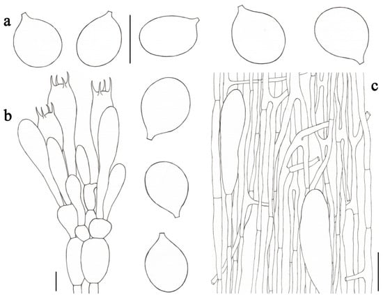 Amanita claristriata (CMUB39992, holotype). (a) Basidiospores. (b) Hymenium and subhymenium. (c) Longitudinal section of volval remnants on pileus. Scale bars: (a,b) = 10 μm, (c) = 50 μm.