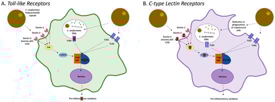 - Yauch, L.E.; Mansour, M.K.; Shoham, S.; Rottman, J.B.; Levitz, S.M. Involvement of CD14, Toll-Like Receptors 2 and 4, and MyD88 in the Host Response to the Fungal Pathogen Cryptococcus neoformans In Vivo. Infect. Immun. 2004, 72, 5373–5382. [Google Scholar] [CrossRef]