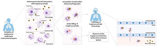 Two Distinct Outcomes of Interactions with Human Innate Phagocytes. Following recognition of cryptococcal cells within the alveoli of the lungs by the host’s pulmonary phagocytes, the innate immune cells are involved in the removal of the pathogen and clearance of the cryptococcal infection. There are two distinct outcomes of the cryptococcal–host interaction. Once C. neoformans cells have been internalized, some cells are capable of actively killing the fungal cells, resulting in clearance of the cryptococcal infection from the host. However, a few cell types/subsets have been shown to be permissive to cryptococcal growth, allowing for intracellular growth and ultimately the trafficking of cryptococcal cells to the central nervous system. These cells are able to transport the fungal cells across the blood–brain barrier (BBB), resulting in the development of cryptococcal meningitis.