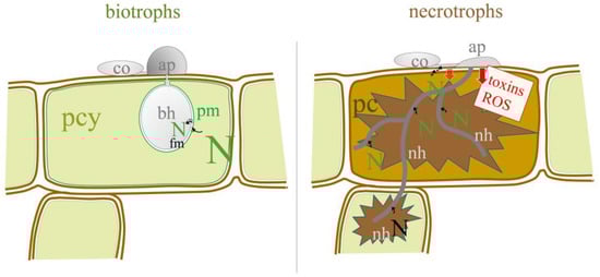 Model of nitrogen (N) availability in/on the host plant for biotrophic and necrotrophic fungi. co, conidia; ap, appressoria; bh, biotrophic hyphae; nh, necrotrophic hyphae; pcy, plant cytoplasm; pc, plant cell; pm, plasma membrane.