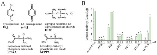Chemical structure of the putative urease inhibitors (A) and urease activity in the presence of different concentrations of five putative urease inhibitors (B) Data are means of three independent experiments. Error bars are standard deviations, asterisks indicate statistically significant differences (Tukey’s post hoc test at p ≤ 0.05).