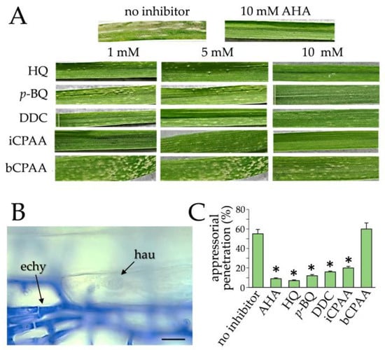 At 12 days post-inoculation (dpi), dense powdery mildew pustules had formed on non-treated wheat leaves (Figure 3A, no inhibitor). At a concentration of 10 mM, all inhibitors except for bCPAA strongly inhibited mildew infection. Intriguingly, HQ and iCPAA yielded strong protection at all concentrations tested, whereas DDC and, to a lesser extent, p-BQ were moderately active (Figure 3A). Microscopy indicated that on untreated leaves, conidia had formed primary and appressorial germ tubes, from which appressoria developed. By 48 hpi, abundant epicuticular hyphae (Figure 3B; echy) had formed with differentiated appressoria, which had breached the epidermal cell wall and formed haustoria (Figure 3B; hau). On leaves treated with 10 mM p-BQ, HQ, DDC, and iCPAA, the formation of appressoria was only slightly reduced (data not shown), but plant invasion and differentiation of haustoria were significantly inhibited (Figure 3C). Consistent with previous data [], AHA also inhibited appressorial penetration and haustorium formation and effectively protected wheat leaves from B. graminis f. sp. tritici infection. The data indicate that this biotrophic powdery mildew fungus requires a functional urease for appressorial host invasion and pathogenesis.