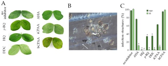 To investigate the effect of urease inhibitors on another biotrophic fungus, we employed the broad bean rust fungus U. viciae-fabae. Like most rust fungi, U. viciae-fabae deposits an appressorium on a stomatal pore [] to invade the host leaf. Subsequently, an infection hypha and a haustorial mother cell are differentiated in the intercellular space, and a haustorium, surrounded by the plasma membrane of the plant, is formed after invading the host cell []. On broad bean leaves that had not been treated with a urease inhibitor, successful U. viciae-fabae infection was indicated by large numbers of uredosori at 12 dpi (Figure 4A, no inhibitor). In contrast, except for the urease inhibitor bCPAA, application of the other urease inhibitors at a concentration of 10 mM, including the reference inhibitor AHA, strongly reduced rust pustule formation by the end of the experiment at 12 dpi.