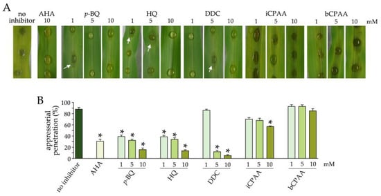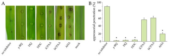 To test for the stability of the urease inhibitors on the leaf surface, we applied the compounds by spraying the entire leaf surface with 10 mM concentrations to the point of run-off, and droplet-inoculated the leaves five days after this treatment with conidial suspensions of C. graminicola. Disease symptoms were analyzed macroscopically and appressorial penetration rates were quantified microscopically at 3 dpi (Figure 6). Maize leaves pre-treated with p-BQ, HQ, DDC, and AHA did not show anthracnose symptoms, suggesting a stable protective effect of these inhibitors over at least five days (Figure 6A). The lack of disease symptoms correlated with the reduction in appressorial penetration rates on leaves pre-treated with these chemistries (Figure 6B). In comparison, iCPAA and bCPAA had no obvious protective effect (Figure 6A), similar to the results of the experiments in which the inhibitors were directly added to the infection droplet (compared with Figure 5). Failure to inhibit the occurrence of anthracnose disease symptoms by iCPAA and bCPAA agrees with the minor and not statistically significant reduction in penetration rates, as compared with the no-inhibitor control (Figure 6B).