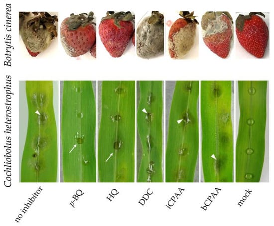 The effect of urease inhibition on fungi with a necrotrophic lifestyle, i.e., the Southern Leaf Spot fungus C. heterostrophus and the grey mold fungus B. cinerea [], were tested using 10 mM each of p-BQ, HQ, DDC, iCPAA, or bCPAA. B. cinerea has a broad host range of more than 1000 plant species, including commercially important fruits such as strawberries, resulting in severe yield and quality losses []. On non-treated plants, clear disease symptoms were observed at 72 hpi. Interestingly, HQ and p-BQ had some protective effect over 72 hpi (Figure 7), but fruits developed typical soft-rot symptoms thereafter (data not shown). In the presence of the other inhibitors, the occurrence of disease symptoms was not delayed, and was clearly visible even at 72 hpi (Figure 7; B. cinerea).