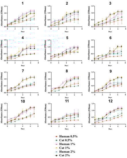 The growth profile of the isolates in the presence of glucose was similar among the 24 S. brasiliensis, regardless of glucose concentrations (Figure 1). In general, all isolates grew poorly in the presence of lactate (Figure 2). The growth of the S. brasiliensis strains herein studied was more abundant in the presence of GlcNAc than lactate (Figure 3). Growth curves for human- and cat-derived S. brasiliensis strains from the familiar outbreaks were similar for all carbon sources evaluated; cases 1, 3, 4, 6, 11, and 12 presented significant growth differences on lactate and cases 1, 6, 8, and 11 on GlcNAc (p-value ≤ 0.05, Mann–Whitney test).