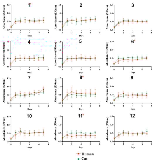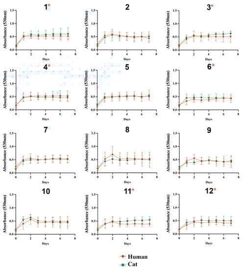 Growth curves of Sporothrix brasiliensis strains from 12 familiar outbreaks of sporotrichosis under 0.5% GlcNAc. The optical density (530 nm) of cultured isolates was measured daily for 7 days. Results are expressed as the mean and standard deviation of readings obtained from three independent experiments performed in technical triplicates. Asterisks indicate significant differences between growth curves of human- and cat-derived strains from the familiar outbreak. The asterisk symbol indicates a statistically significant difference between the growth curves of paired cases, p-value (Mann–Whitney test) ≤ 0.05.
