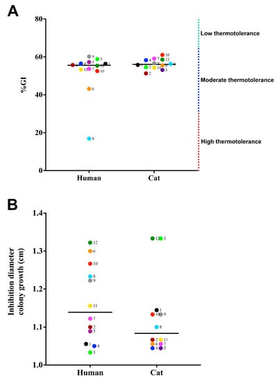 Resistance of Sporothrix brasiliensis strains from 12 familiar outbreaks of sporotrichosis against physical and chemical stressors. (A) Thermotolerance of S. brasiliensis, the smaller the percentage of growth inhibition (%GI), the greater the thermotolerance of the isolates. (B) Diameters in millimeters of growth inhibition of S. brasiliensis against exposure of yeast cells to 5% hydrogen peroxide. Each dot represents the mean value of three independent experiments performed in technical triplicates. Dot colors and numbers after dots represent the different familiar outbreaks. Black lines represent the median value of each group of strains.