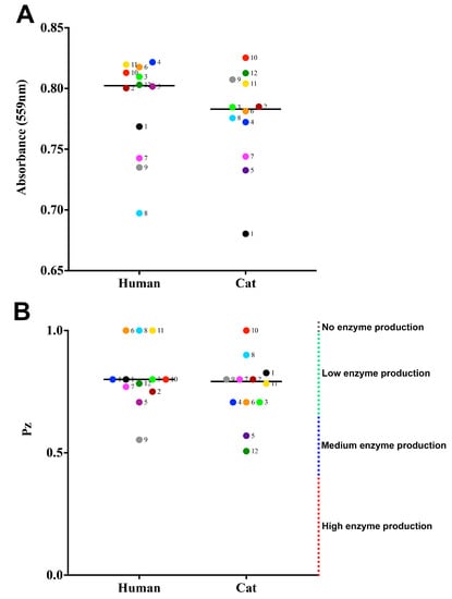 Production of extracellular enzymes by Sporothrix brasiliensis strains from 12 familiar outbreaks of sporotrichosis. Results are expressed as the mean and standard deviation of (A) urease and (B) hemolytic activity. Urease activity is expressed as the optical density (559 nm) of yeast S. brasiliensis cultures in Christensen’s urea broth after 7 days of growth at 35 °C. Hemolytic activity is expressed as the Pz of the enzyme of yeast S. brasiliensis cultures on sheep blood agar. Each dot represents the mean value of three independent experiments performed in technical triplicates. Dot colors and numbers after dots represent the different familiar outbreaks. Black lines represent the median value of each group of strains.