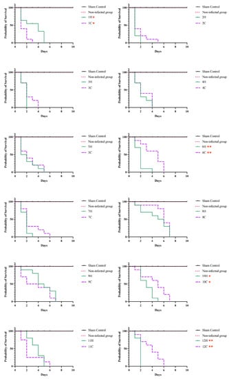 Survival curves of Tenebrio molitor larvae infected with Sporothrix brasiliensis strains from 12 familiar outbreaks of sporotrichosis. Larvae were infected with a 10 µL suspension containing 1 × 106 yeast-like cells and incubated at 37 °C and observed until 10 days after inoculation. A total of 40 animals were included in each experimental group, and these were monitored daily to assess mortality, which was defined as a lack of irritability and the presence of extensive body melanization. The asterisk symbol indicates a statistically significant difference between the growth curves of paired cases, p-value (Log-rank (Mantel-Cox) test) ≤ 0.05.