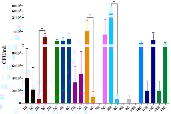 Colony-forming units (CFUs/mL) of Sporothrix brasiliensis in Tenebrio molitor. Results are expressed as the mean plus standard deviation of three independent experiments performed in technical triplicates. Bar colors represent the different familiar outbreaks. ** p = 0.0022, Mann–Whitney test.