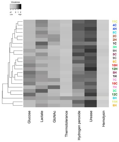 Global expression of putative virulence-associated factors by Sporothrix brasiliensis strains from 12 familiar outbreaks of sporotrichosis. The gray scale in the heatmap ranges from low (white) to high virulence (black). Different strains are represented in the lines of the heatmap, and the different virulence factors herein are studied in the columns of the heat map. Strains were grouped in a dendrogram reflecting the similarity between the virulence-related phenotypes of each strain. Colors of the strain identification numbers represent the different familiar outbreaks.