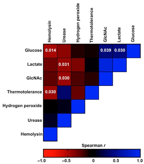 Possible correlations between the different fungal phenotypes were also investigated. Figure 10 shows a heatmap representing the Spearman’s correlation coefficients of the associations between different phenotypes of the studied isolates. The red color represents negative associations, whereas the blue color represents positive associations. Growth on glucose was negatively monotonically related to growth on GlcNAc (p-value = 0.039) and lactate (p-value = 0.030). Hemolysin production was positively monotonically related to growth on glucose and thermotolerance (p-values = 0.014 and =0.030, respectively), while urease production was positively monotonically related to growth on lactate and GlcNAc (p-values = 0.031 and =0.030, respectively).