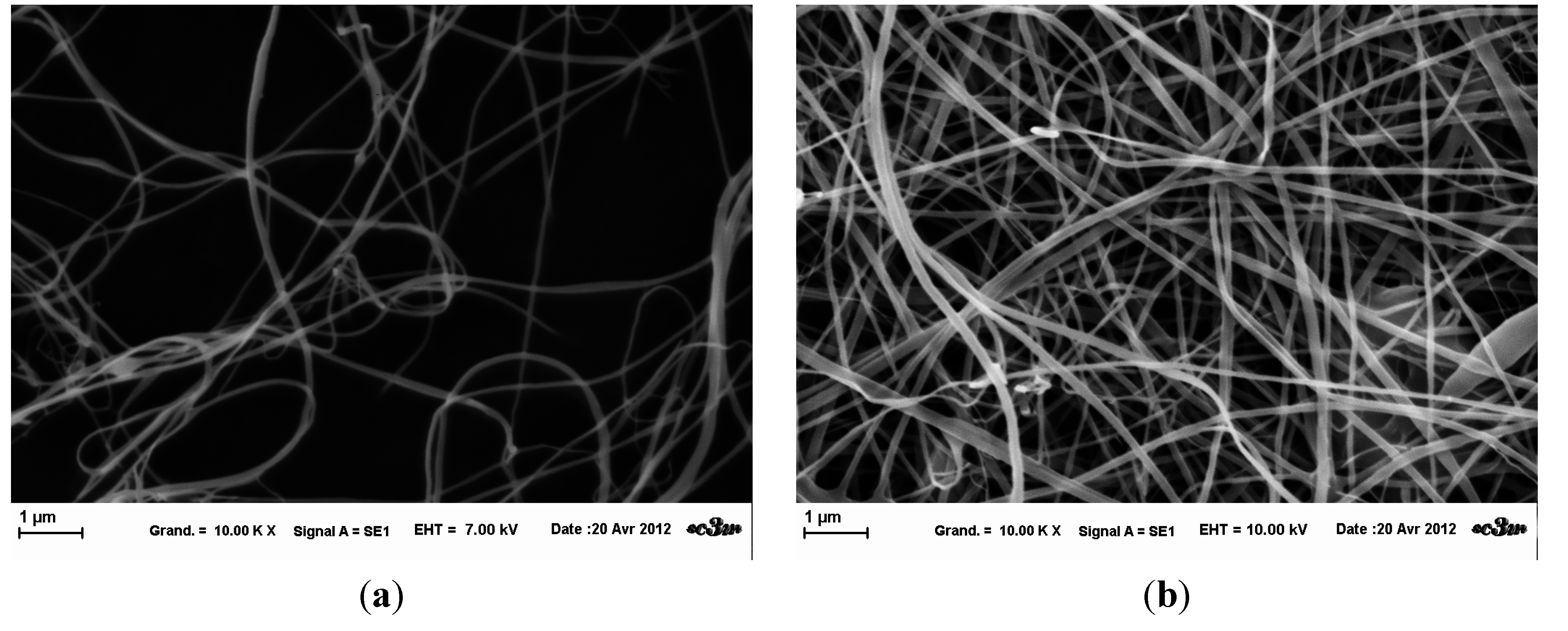 Figure 7). Through SEM observations, it was noted that there is coexistence of fibers of different diameters (100 nm–500 nm), and also a beaded-structure.