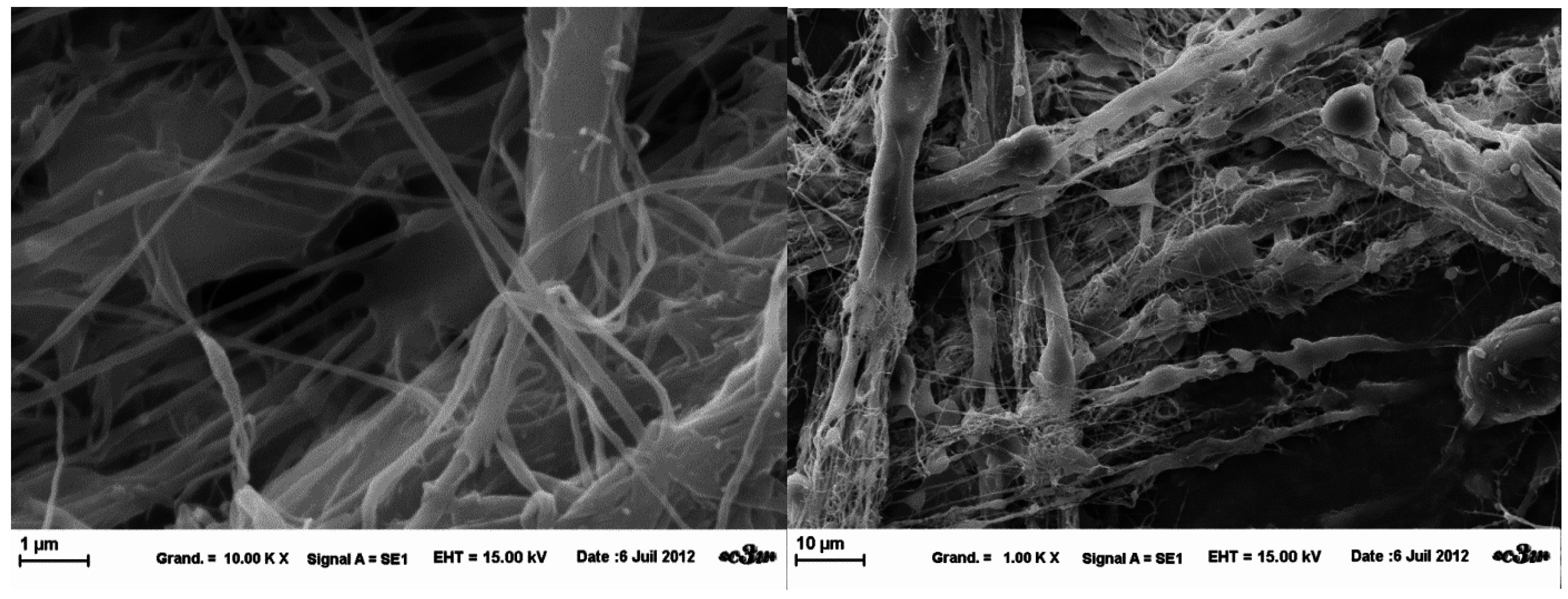 SEM images of template A nanofibers obtained at fixed parameters (35 kV, 4.5 mL/H, 20 cm distance and 1mm tip), at 1 k× magnification (left) and 10 k× (right).